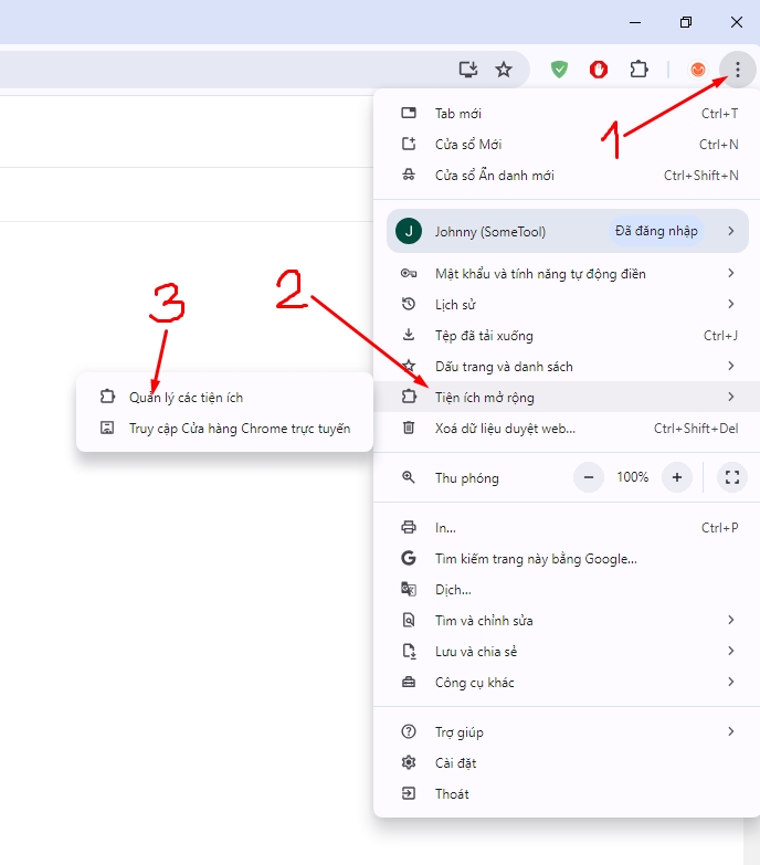 B. Trên trình duyệt Chrome, ở góc trên bên phải chọn dấu 1. Dấu ba chấm -> 2. Tiện ích mở rộng -> **3.** Quản lý các tiện ích