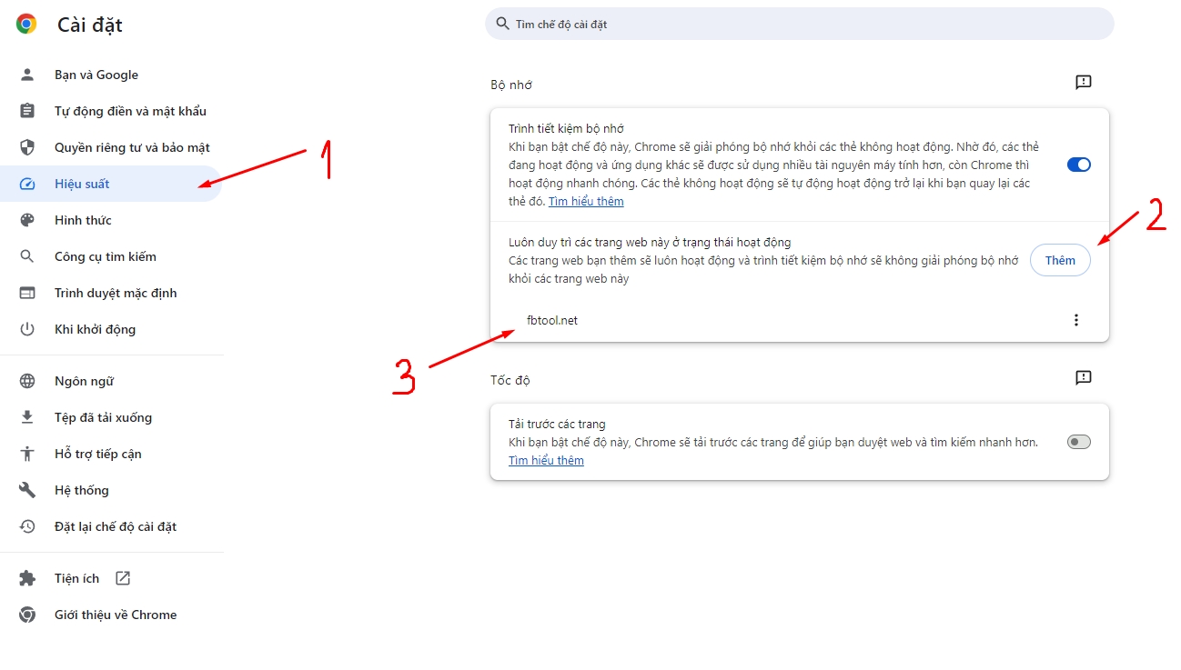 Chọn dấu 3 chấm góc trên bên phải của trình duyệt -> Cài đặt -> Hiệu suất -> thêm MailingTool.net
