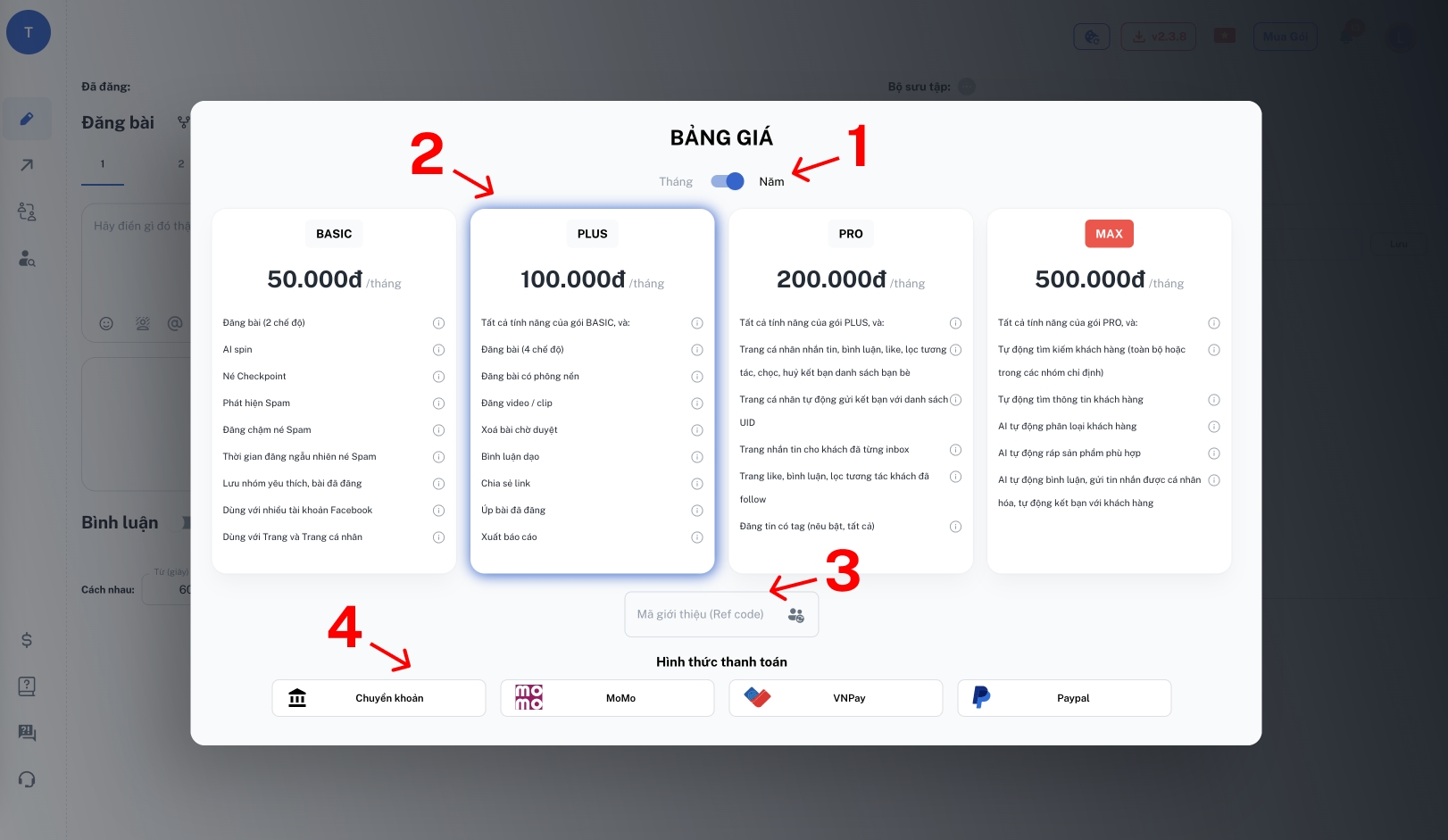 Nâng cấp gói không áp dụng khi bạn mua gói giống nhau. Ví dụ: bạn đang dùng gói Basic tháng còn 15 ngày, bạn mua thêm gói Basic 1 năm thì bạn sẽ trả 600k, hệ thống sẽ + 360 ngày, và số ngày hiển thị trên tool là 375 ngày.
